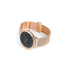 Orologio fashion di tendenza da uomo al quarzo,cassa in acciaio,quadrante nero,vetro minerale,bracciale in acciaio.Caratteristiche tecniche:movimento al quarzo giapponese Myota,cassa in acciaio inossidabile gold rose lucido da 40 mm di diametro con lo spessore da 07 mm,fondello in acciaio a vite,quadrante color nero con indici e lancette gold rose,vetro minerale anti shock e graffi,water resistant 05 atm 50 metri,bracciale in acciaio inossidabile gold rose lucido a maglia Milanese con chiusura di sicurezza regolabile a pressione. Garanzia internazionale 2 anni. Swiss made.