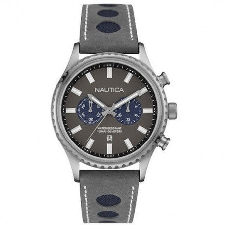 Orologio NAUTICA maschile - Movimento: Chrono con data - Fondo: A Vite - Diametro: 43 mm - Cassa: In acciaio - Ghiera: In acciaio zigrinata - Corona: A Vite - in acciaio - Quadrante: Grigio scuro con volantini blu - Vetro: Ottico Minerale - Cinturino: Pelle grigio con rifiniturea cerchio in tessuto blu - Chiusura: Ardiglione - In acciaio - Water Resistant: 100 mt.