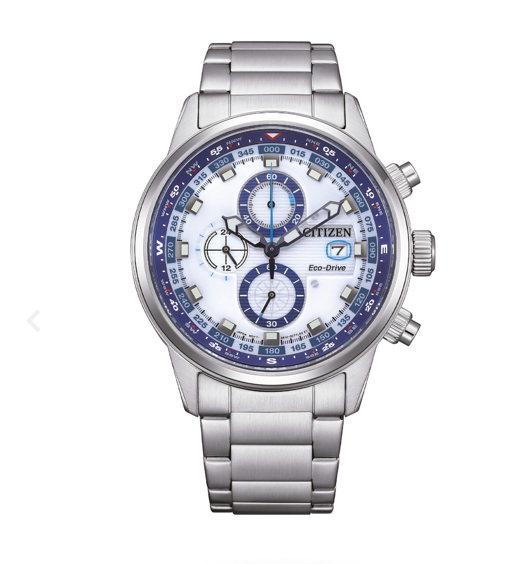 Orologio cronografo 1\10 sec di Citizen della collezione of action 2024. Orologio da uomo. Orologio con cassa in acciaio con fondo serrato a vite diametro cassa 42mm. Bracciale in acciaio con chiusura a pulsante. Orologio con resistenza all'acqua di10 atm. Orologio con quadrante bianco su due livello con indici applicati e trattamento luminous come le lancette con vetro minerale. Orologio eco drive con riserva di carica di 7 mesi .