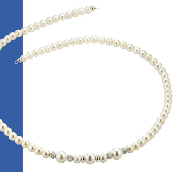COLLANA CON PERLE E CON 6 ELEMENTI, 4 SFERE D'ORO BIANCO SATINATE E 2 DISCHI